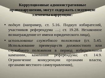 3. Административные коррупционные правонарушения — обладающие признаками коррупции и не являющиеся преступлениями правонарушения, за совершение которых законодательством РФ предусмотрена административная ответственность.