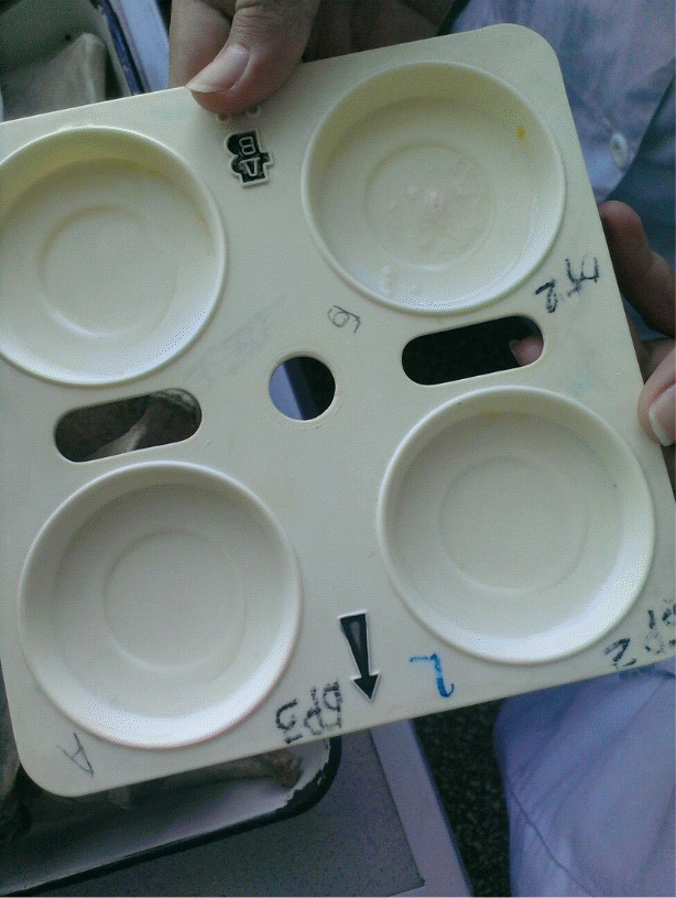 Оборудование и реактивы: пластинки ПМК-1 молочно-контрольные, пипетки на 1 мл, цилиндр мерный на 100 мл, препарат мастоприм (2,4%- ный раствор), деревянная палочка. Для приготовления раствора мастоприма в мерный цилиндр на 100 мл вносят 2,5 г препарата и доливают до метки дистиллированной водой, нагретой до 30-35 °С, и хорошо перемешивают. Хранят раствор при 16-22 °С. Срок годности 3 мес. В случае, если раствор охлаждается ниже 16 °С, в нем выпадает осадок препарата, поэтому перед применением его следует подогреть до 30-35 °С на водяной бане.
