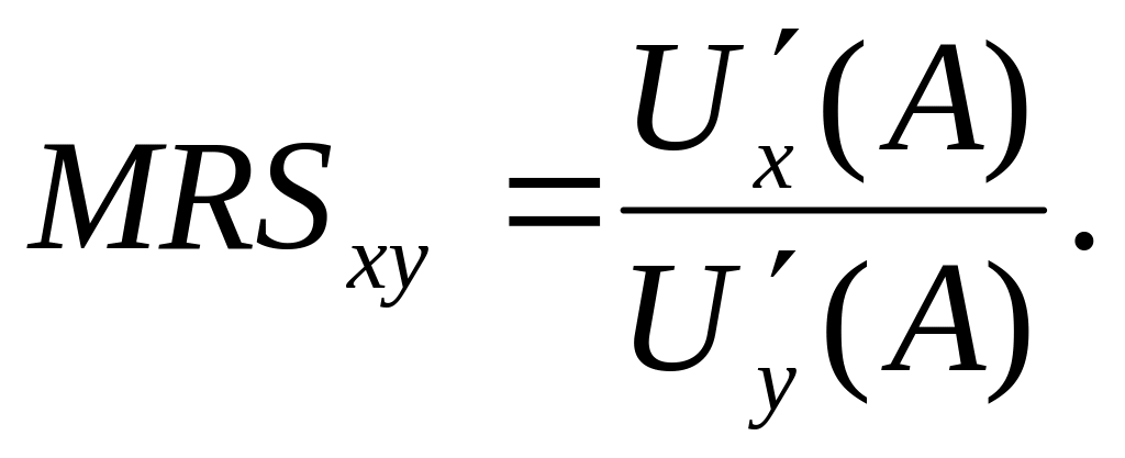 Предельной нормой замещения х на у в точке А называется предел отношения (–у) /х , когда точка В стремится к А, оставаясь на одной с А линии уровня функции U(x, у). Предельная норма замещения обозначается MRSху или MRSху(А), если необходимо явно указать ее зависимость от точки А.