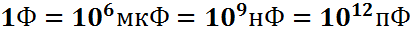 Фарад — очень крупная единица емкости, которая практически не применяется. Обычно используют более мелкие единицы емкости — микрофарад (мкФ), нанофарад (нФ) и пикофарад (пФ):