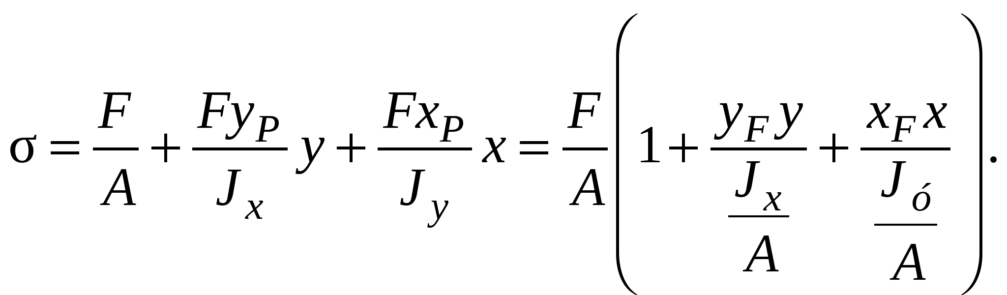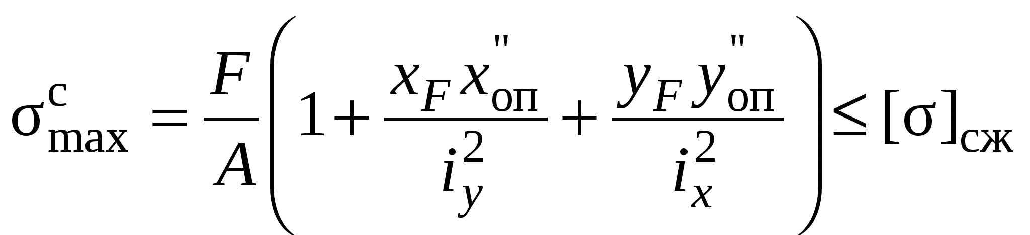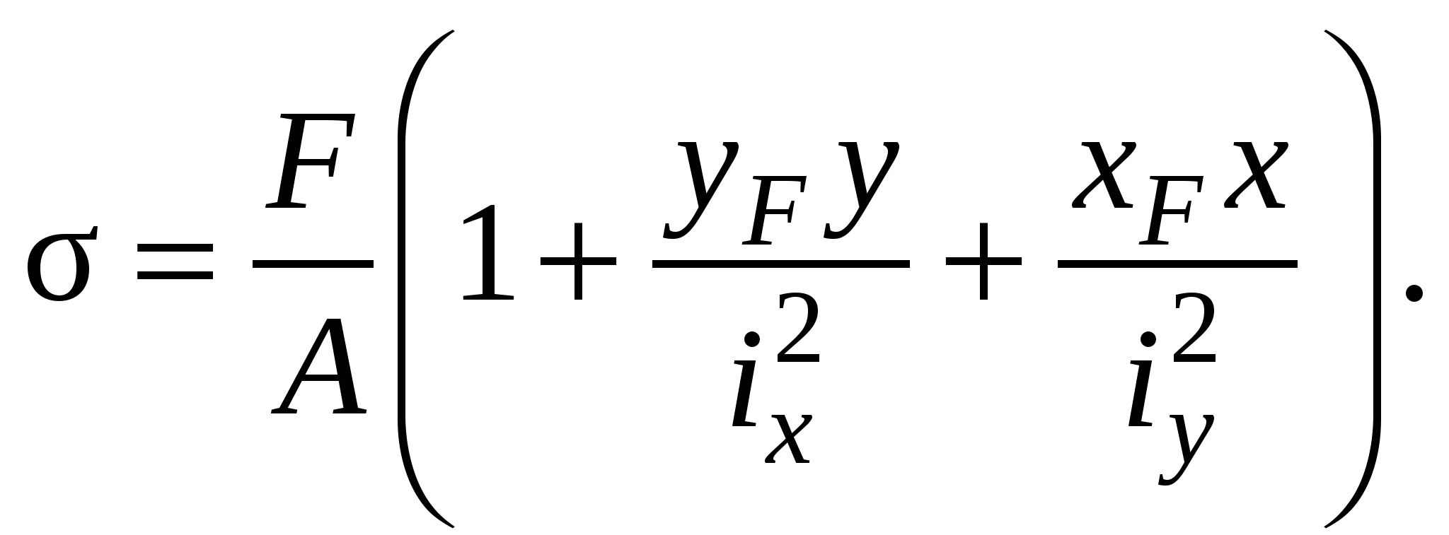 При определении напряжений по формуле величины хF, х, уF, у берутся с учетом их знака относительно координатных осей. В условиях внецентренного сжатия перед правой частью формулы ставится знак минус.