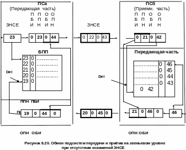 Этот метод защиты рекомендован при величине задержки распространения сигнала в звене сигнализации, превышающей 15 мс, что характерно для спутниковых линий (рис. 8.22). Для увеличения пропускной способности ЗС, использующего такую линию, все имеющиеся в БПП ЗНСЕ передаются циклически до тех пор, пока не будет получено положительное подтверждение. Это подтверждение может относиться ко всем ранее переданным ЗНСЕ или лишь к одной или части из них.