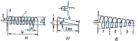 Рисунок 7.9 - Спиральные антенны: а – цилиндрическая; б – развернутый