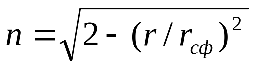 Имеется несколько типов линзовых антенн, позволяющих обеспечить широкий сектор качания (сканирования) луча. Таким свойством, например, обладают сферическая и цилиндрическая линзы Люнеберга [8]. Например, в линзе Люнеберга со сферической симметрией (рисунок 7.16) показатель преломления должен изменяться по формуле
