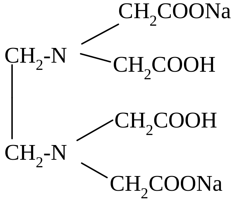 В практике анализа наиболее часто используют комплексон III (ЭДТА) Nа2H2C10H12O8N22H2O в связи с лучшей растворимостью его в воде. С катионами металлов ЭДТА образует комплексные соединения в соотношении 1:1. Комплексы многих металлов с ЭДТА образуются легко, обладают достаточной устойчивостью и в большинстве растворимы в воде. Все это позволяет использовать ЭДТА для титриметрического определения солей металлов.