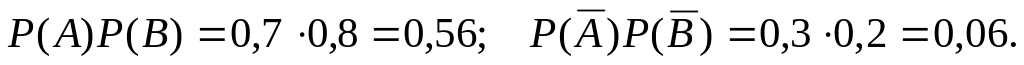 Тот же результат можно получить другим способом – находим вероятности того, что оба стрелка попали в цель и оба промахнулись. Эти вероятности соответственно равны: