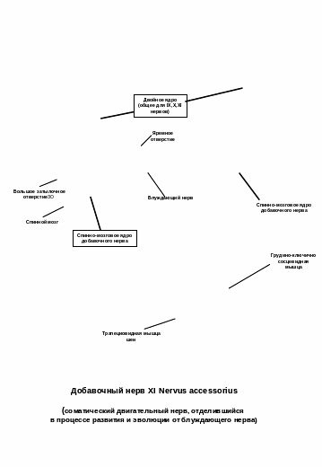 XI пара — добавочный нерв (n. accessorius), который начинается от двигательного ядра, расположенного в нижней части продолговатого мозга и первом-четвертом шейных сегментах спинного мозга. Соответственно он имеет черепные и спинномозговые корешки, которые объединяются в ствол нерва. Последний проходит через яремное отверстие и делится на внутреннюю и наружную ветви. Внутренняя ветвь присоединяется к блуждающему нерву, она содержит волокна, участвующие в двигательной иннервации глотки и гортани. Наружная ветвь снабжает грудино-ключично-сосцевидную и трапециевидную мышцы; она часто соединяется с шейным сплетением.