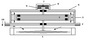 Рис. 3.3.Конструктивная схема гидроагрегата с реактивной гидротурбиной и синхронным гидрогенератором: 1 –гидротурбина, 2 – нижняя крестовина гидрогенератора с нижним направляющим подшипником, 3 – корпус гидрогенератора, 4 - статор гидрогенератора с трехфазной обмоткой якоря, 5 – ротор (индуктор) гидрогенератора с с обмоткой возбуждения постоянного тока и контактными кольцами, 6 - верхняя крестовина гидрогенератора с верхним направляющим подшипником, 7 – корпус подпятника турбогенератора с масляной ванной и системой охлаждения масла, 8 – опорная пята, укрепленная на валу, 9 – подпятник, 10 – направляющий аппарат гидротурбины и рабочий поток воды. |