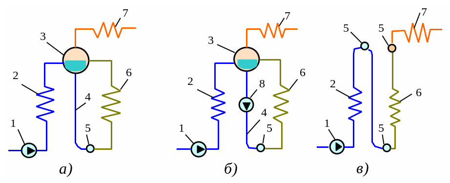 1 – питательный насос; 2 - водяной экономайзер; 3 – барабан; 4 – опускная труба; 5 – коллектор; 6 – испарительные трубы; 7 – пароперегреватель; 8 – циркуляционный насос.