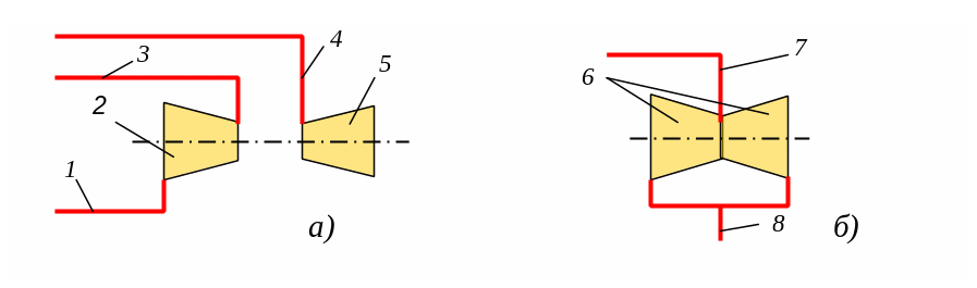 1 – выход пара из ЧВД на промперегрев; 2 – ЧВД; 3 – подвод свежего пара в ЧВД; 4 – подвод пара от промперегрева в ЧСД; 5 – ЧСД; 6 – ЧНД; 7 – подвод пара в ЧНД; 8 – отвод пара из ЧНД.
