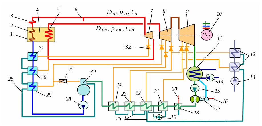 1 – экономайзер котла; 2 – испарительные поверхности нагрева; 3 – пароперегреватель; 4 - котел; 5 – промежуточный пароперегреватель; 6 – отбор пара на эжекторы и уплотнения; 7 – часть высокого давления (ЧВД); 8 – часть среднего давления (ЧСД); 9 – часть низкого давления (ЧНД); 10 – электрогенератор; 11 – конденсатор; 12 – сетевые подогреватели; 13 – сетевой насос; 14 - циркуляционный насос; 15 – конденсатный насос; 16 – подача пара на эжектор; 17 – эжектор; 18 – сальниковый подогреватель; 19 – дренажный насос; 20 – пар из уплотнений; 21, 22, 23, 24 – подогреватели низкого давления: ПНД-1, ПНД-2, ПНД-3, ПНД-4 соответственно; 25 – каскадный слив конденсата; 26 – деаэратор; 27 – редукционно-охладительное устройство; 28 – питательный насос; 29, 30, 31 – подогреватели высокого давления: ПВД-1, ПВД-2, ПВД-3 соответственно; 32 – защитные обратные клапана.