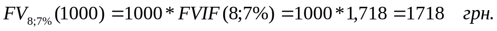 Приклад 1. Треба порівняти, що більше за ставкою складних відсотків і = 7% - 1000 грн. сьогодні чи 2000 грн. через 8 років.