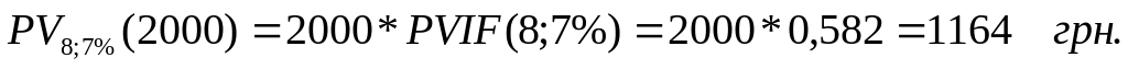 Отже, за ставкою дохідності 7%, 2000 грн., які будуть отримані через 8 років, на сьогодні є більшими за 1000 грн. на 164 грн.