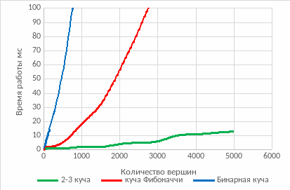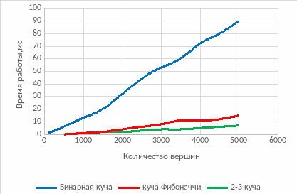 В качестве бинарной кучи будем использовать std::priority_queue из библиотеки шаблонов C++. Фибоначчиева куча и 2-3 куча были реализованы мной.