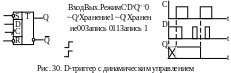 D-триггеры имеют один информационный вход D и вход синхронизации С. В интегральном исполнении D-триггеры выпускаются как со статическим, так и с динамическим управлением по входу С. В любом случае в маркировке микросхем D-триггеров используются буквы ТМ.