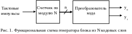 Счетчик по модулю N определяет длину блока, изменяя свое состояние на единицу с каждым тактовым импульсом. Счетчик работает циклами, обеспечивая тем самым непрерывную последовательность блоков. Каждому i-у (i = 0, 1, 2, …, N-1) состоянию счетчика в цикле ставится в соответствие определенное 2-разрядное двоичное слово у1у0. Поскольку разрядность слов не совпадает с разрядностью счетчика, в устройство введен преобразователь кода. Последний также обеспечивает заданную структуру блока (порядок следования слов в блоке).