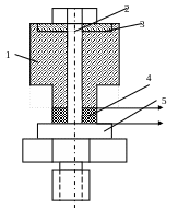 1- гравитационная масса, 2 – стягивающий болт, 3 – плоская пружина, 4 – пъезоэлектрическая керамическая шайба, 5 – основание датчика с крепежной разьбой.