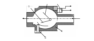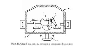 1 – основная заслонка; 2 – демпфирующая заслонка; 3 – преобразователь сигнала (потенциометрического типа); 4 – корпус датчика; 5 – винт регулирования дополнительного (байпасного) воздуха.