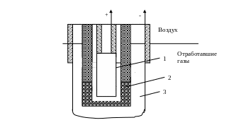1 – внутренний электрод, 2 – твердый электролит (двуокись циркония с добавкой иттрия) 3 - наружный электрод (оба электрода выполнены из пористой пластины с добавкой родия).