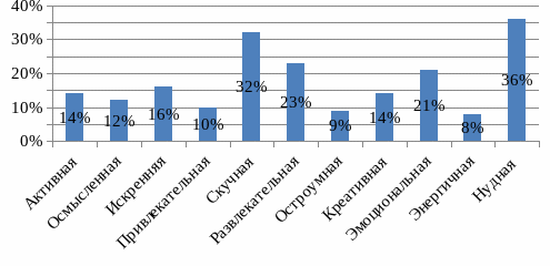 Анализ информации, представленной на рисунке 2.3-3, позволяет утверждать, что 14% опрошенных (14 человек) считают отечественную рекламу активной и креативной, 12 % (12 человек) - осмысленной, 16% респондентов (16 человек) считаю нашу рекламу искренней, 10% (10 человек) считают ее привлекательной, 23 % (23 человека) – развлекательной, 9% (9 человек) – остроумной. 21% опрошенных считаю, что отечественная реклама эмоциональная, а 3% (3 человека) – энергичная. Но 32% респондентов (32 человека) считают, что отечественная реклама – скучная и 36% опрошенных (36 человек) думают, что она нудная.