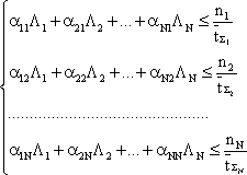Интенсивности прихода заявок в j-ый узел λ1, λ2… λN выражены в (11‑3) через интенсивности входных потоков сети Λ1,... ΛN.