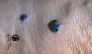На профілактичному огляді в поліклініці у пацієнта на шкірі зовнішньої поверхні правого стегна виявлено два елементи овальної форми,синюшного кольору,0,5-1,5см.Суб’єктивно не турбує.