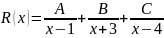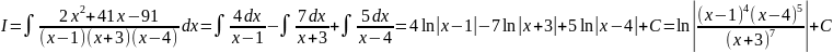 Те же значения постоянных А, В, С можно получить и из следующих соображений. Тождественное равенство двух функций означает, что они совпадают при любых значениях х . Подставляя в тождество многочленов х-1, получим - 48 = -12А т.е. А = 4; подставляя х = -3, получим -196 = 28В, т.е. В = -7; подставляя х = 4, получим 105 = 21С, т.е. С = 5.