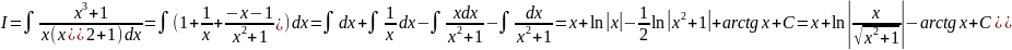 Степень многочлена, стоящего в числителе подынтегральной дроби, равна степени многочлена, стоящего в ее знаменателе, т.е. дробь неправильная, поэтому перед разложением дроби на простейшие надо выделить в ней целую часть. В общем случае это делают делением многочленов, но в данном случае проще выделить в числителе многочлен, стоящий в знаменателе, прибавив и отняв в числителе X, т.е.