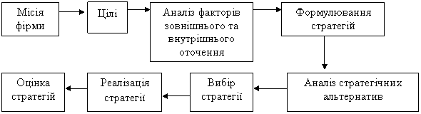Основною ідеєю, як видно зі схеми, є місія організації. Відповідно до обраної місії вищим керівництвом ставиться мета. Для реалізації цілей необхідно досліджувати усі фактори зовнішнього і внутрішнього оточення для того, щоб згодом сформулювати можливі стратегії. Аналіз розроблених стратегій і вибір оптимальної виробляється з урахуванням можливостей фірми і факторів зовнішнього оточення. Вибором стратегії в основному закінчується процес планування. На етапах реалізації і наступної оцінки прийнятої стратегії виявляються її сильні і слабкі сторони, при необхідності вносяться відповідні корективи. Багато підприємств після аналізу реалізації розроблених планів коректують і місію організації.