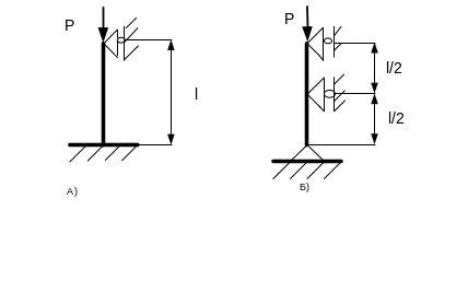 Устойчивость сжатого стержня на схеме Б выше т.к. его гибкость меньше, чем у схемы А. Б( )<А( )