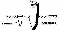 При перенесении проекта трассы с плана или карты в натуру выполняют следующие работы. На местности закрепляют точки поворота трассы, кольями, называя их вершинами углов (ВУ №1, ВУ №2 и т.д. Рис. 89.) На каждой вершине измеряют горизонтальные углы, одним полным приемом. Затем трассу разбивают на отрезки по 100 м, закрепляя их кольями и сторожками (рис.90), называя пикетами. На рис. 89 изображен участок трассы до пикета № 7, т.е. длиной 700 м. Автомобильная (железная) дорога будет строиться не по ломанной линии (ее длина 700 м), а по закруглению, т.е. длина тарссы станет короче до ПК7 и закрепленные ранее пикеты окажутся ближе к нулевому пикету и их надо будет все переносить на новое место в сторону предыдущего пикета. Поэтому разбивку пикетов осуществляют сначала до вершины угла №1 (ВУ №1), вычисляют элементы закругления и в первую очередь домер (Д) и положение главных точек кривой.
