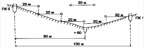 Землемерная лента удерживается ее началом (0 м) с помощью шпильки в горизонтальном положении (на глаз) в створе линии 0-ВУ №1, затем конец ленты (рулетки) шпилькой проектируется на землю, в точку А1, лента протягивается далее по створу, аналогично откладывается следующая длина ленты и т.д. до 100 м и закрепляется колышек и сторожок (на котором записывается номер пикета). Если местность между пикетами (0-1) имеет перегиб (характерная точка), то он закрепляется колышком, измеряется расстояние от предыдущего пикета до него; называют такую точку плюсовой (на рис. 91 “+60м”). Если местность имеет наклон не более 30, то ленту (рулетку) укладывают в створе по земле.