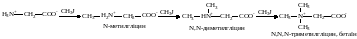 7. Алкілування амінокислот. При алкілуванні амінокислот, залежно від кількості взятої алкілуючої речовини, утворюються вторинні, третинні алкіловані амінокислоти, а в кінцевому результаті – четвертинні амонійні основи, внутрішні солі яких називають бетаїнами: