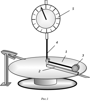 Основной частью установки (рис. 1) является вращающийся относительно вертикальной оси металлический диск 1. Вдоль радиуса диска укреплено направляющее ребро 2 , на котором помещаются исследуемые тела 3 цилиндрической формы.