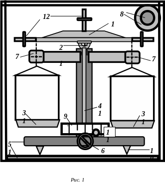 Аналитические весы служат для точного определения массы тел. Основной частью весов является равноплечий рычаг 1, называемый коромыслом. В середине коромысла перпендикулярно его основанию укреплена агатовая призма. Своим ребром она опирается на плоскую агатовую подушку, укрепленную на верху колонки 2. На равном расстоянии от середины призмы вблизи концов коромысла расположены две другие призмы, на которые подвешены чашки весов 3. В средней части коромысла прикреплена стрелка 4, которая позволяет определять положение равновесия весов. Весы монтируются на стеклянном или пластмассовом основании 5 и помещаются в стеклянный корпус с подъемной верхней крышкой и подвижными боковыми дверцами (рис.1).
