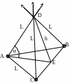 Полная напряженность будет суммой трех векторов (см. рис.). Горизонтальные составляющие этих векторов в сумме дадут нуль, так как они равны по модулю и составляют друг с другом углы по 120о. Сами векторы образуют с вертикалью углы 90о – α, где α – угол между ребром тетраэдра и высотой h треугольника ABC. Вертикальные составляющие одинаковы и равны каждая