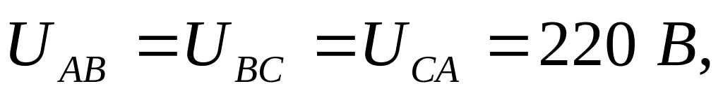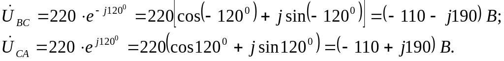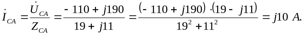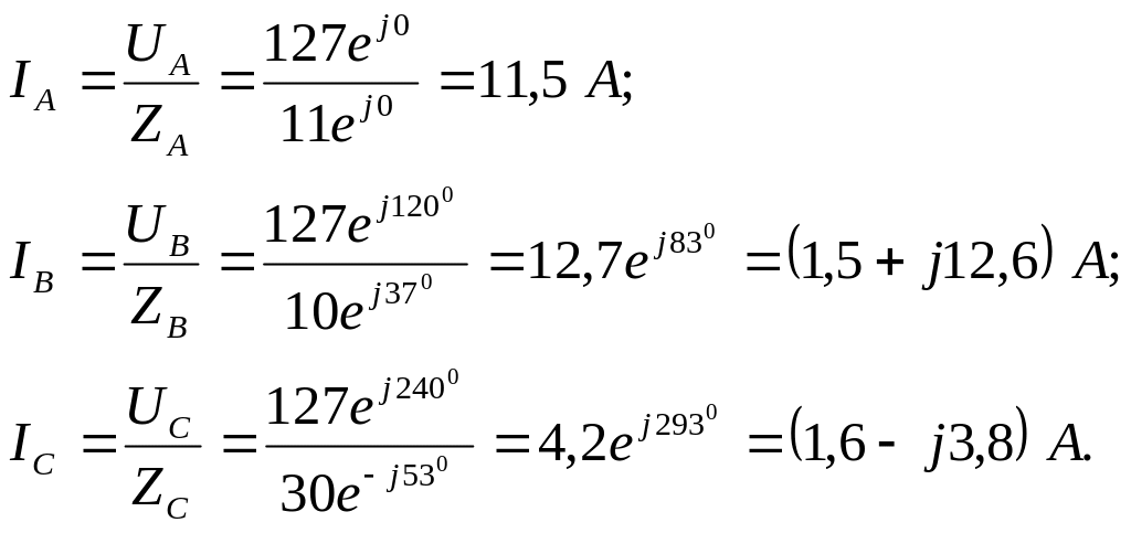 Оскільки всі фазові зсуви визначені відносно лінійної напруги UAB, то (-j) означає запізнення струму ІВС від напруги UAB на 900, а (j) - випередження струму ІСА відносно цієї ж напруги також на 900. Відносно напруг UBC і UCA струми в цих фазах мають фазові зсуви, які відповідають характерам їх опорів – струм ІВС випереджає напругу UBC (ємнісне навантаження), а струм ІСА відстає від напруги UCА (індуктивне навантаження). Струм ІАВ збігається з напругою UAB (активне навантаження).
