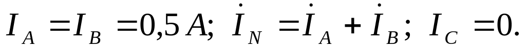 1.3.2. В схемі з’єднання приймачів зіркою напруга між кожним лінійним провідником і нейтраллю дорівнює 120 В. Лампи потужністю 60Вт ввімкнені між провідником А і нульовою точкою та провідником В і нульовою точкою. Визначити струми в провідниках та побудувати векторну діаграму.