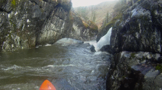 За ЛП шивера далее на местном ПП разгон 40м,слив через всю реку, ближе к ПБ водопадный около 2м. Левее положе но сразу большая полуобливная глыба на которую хорошо кидает. Ниже слива две метровые бочки. Порог обрамлен высокими скалами, сурово и красиво.