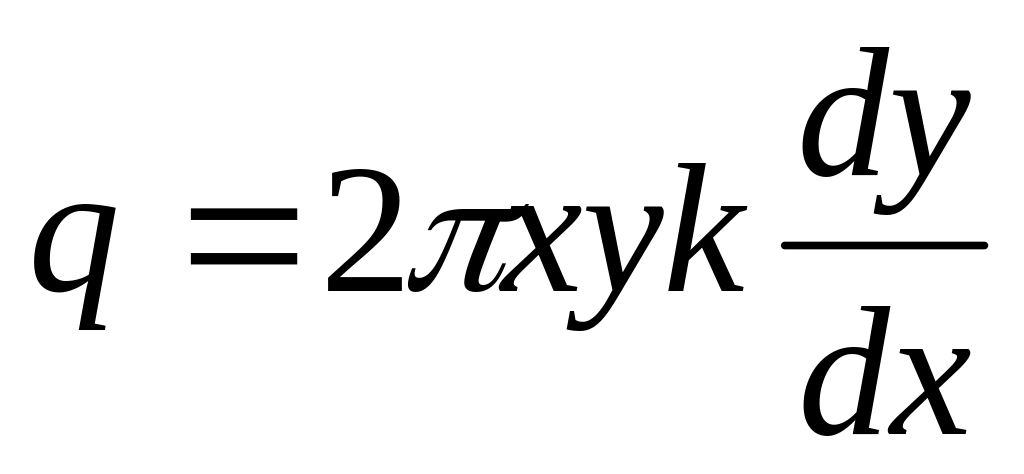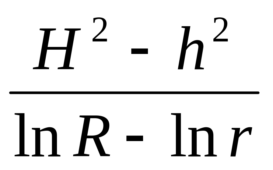 Для определения дебита полученное выражение проинтегрируем по х в пределах от r (радиус скважины) до R (радиус депрессионной кривой); по у в пределах от h (глубина воды в скважине) до H (мощность водоносного горизонта):