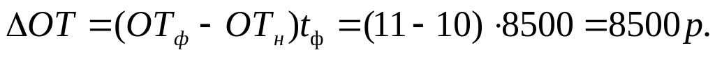 Отклонение по эффективности рассчитывается как разница между фактическими и нормативными трудозатратами (скорректированными на фактический выпуск), умноженная на нормативную ставку: (8500-8100)*4=1600 р. (Н)