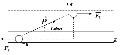 .Эти силы образуют пару, плечо которой равно l·sina, т.е. зависит от ориентации диполя относительно поля. Модуль каждой из сил равен q×E. Умножив его на плечо, получим величину момента пары сил, действующей на диполь: