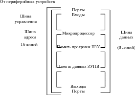 Микропроцессор координирует работу всех устройств цифровой системы с помощью шины управления (ШУ). Помимо ШУ имеется 16-разрядная адресная шина (ША), которая служит для выбора определенной ячейки памяти, порта ввода или порта вывода. По 8-разрядной информационной шине или шине данных (ШД) осуществляется двунаправленная пересылка данных к микропроцессору и от микропроцессора. Важно отметить, что МП может посылать информацию в память микроЭВМ или к одному из портов вывода, а также получать информацию из памяти или от одного из портов ввода.