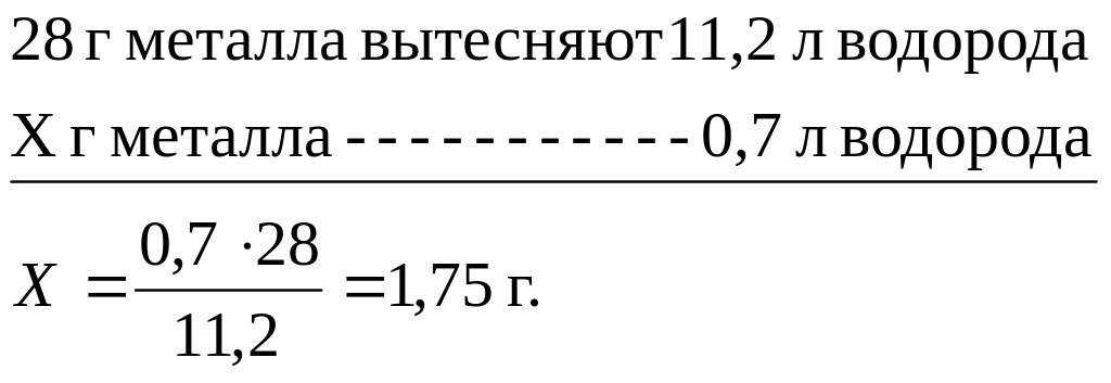 36. Некоторое количество металла, эквивалент которого равен 28 г, вытесняет из кислоты 700 мл водорода, измеренного при нормальных условиях. Определить массу металла.
