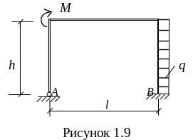 Пример 1.2. Построить эпюры внутренних усилий для заданной статически неопределимой плоской рамы, показанной на рисунке 1.9. Стойки и ригель рамы имеют одинаковую жесткость EI. При расчетах принять: l = 6 м, h = 4 м, М = 8 кНм и q = 4 кН/м.