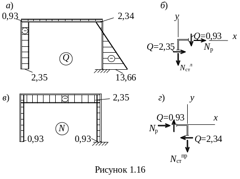 Знак «» у продольной силы в ригеле Np означает, что ригель сжат. Левая стойка тоже сжата. Вырезаем правый верхний узел (рисунок 1.16, г). Поскольку продольное усилие в ригеле известно, достаточно для определения продольной силы в правой стойке составить сумму проекций на ось у.