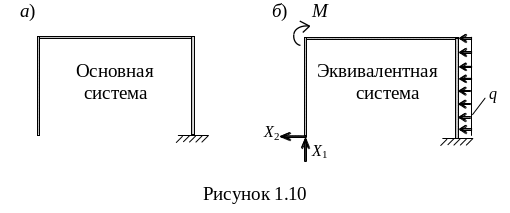 2 В соответствии с методом выбираем статически определимую основную систему путем отбрасывания лишних связей (рисунок 1.10, а). На рисунке 1.10, б показана эквивалентная система, полученная путем нагружения основной системы заданной нагрузкой и неизвестными усилиями Х1 и Х2, которые представляют собой реакции в отброшенных связях левой опоры.