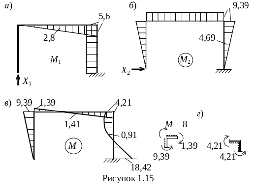 2.6. Строим эпюру М1, как: М1 = Х1 (рис. 1.7, е) и, далее, строим результирующую эпюру М, в виде суммы М = М1 + МР (рис. 1.7, ж).