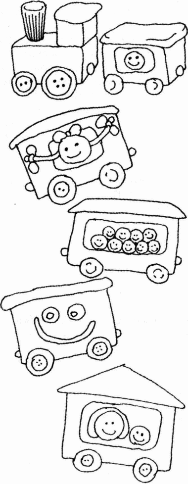 Воспитатель обращает внимание де- *ей на подготовленные материалы и ещё :аз ставит творческую задачу: «Сейчас «ы с вами сделаем длинный-длинный *эезд из брусков пластилина, у меня на голе уже стоит паровоз с вагончиком, эы сделаете свои вагончики, и мы их соединим в один состав». Дети лепят. Если :ни быстро справляются с заданием, воспитатель советует добавить окошки и слепить пассажиров, которые сидят в ва- ■ончиках и смотрят в окошки. Воспитатель напевает песенку «Вот поезд наш едет, колёса стучат, а в поезде нашем ребята сидят...». Дети подпевают.