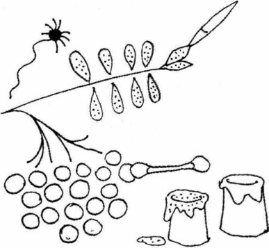 Предварительная работа. Наблюдение за деревьями (рябина, калина), рассматривание их плодов. Беседа об осенних изменениях в природе. Дидактические игры «С какого дерева листок?», «Листья и плоды (семена)». Освоение нетрадиционных техник и художественных материалов (ватная палочка, незаострённый конец карандаша, возможно, с ластиком, пальчики, штампики). Экспериментирование с художественными материалами для получения однотипных отпечатков (модульное рисование).